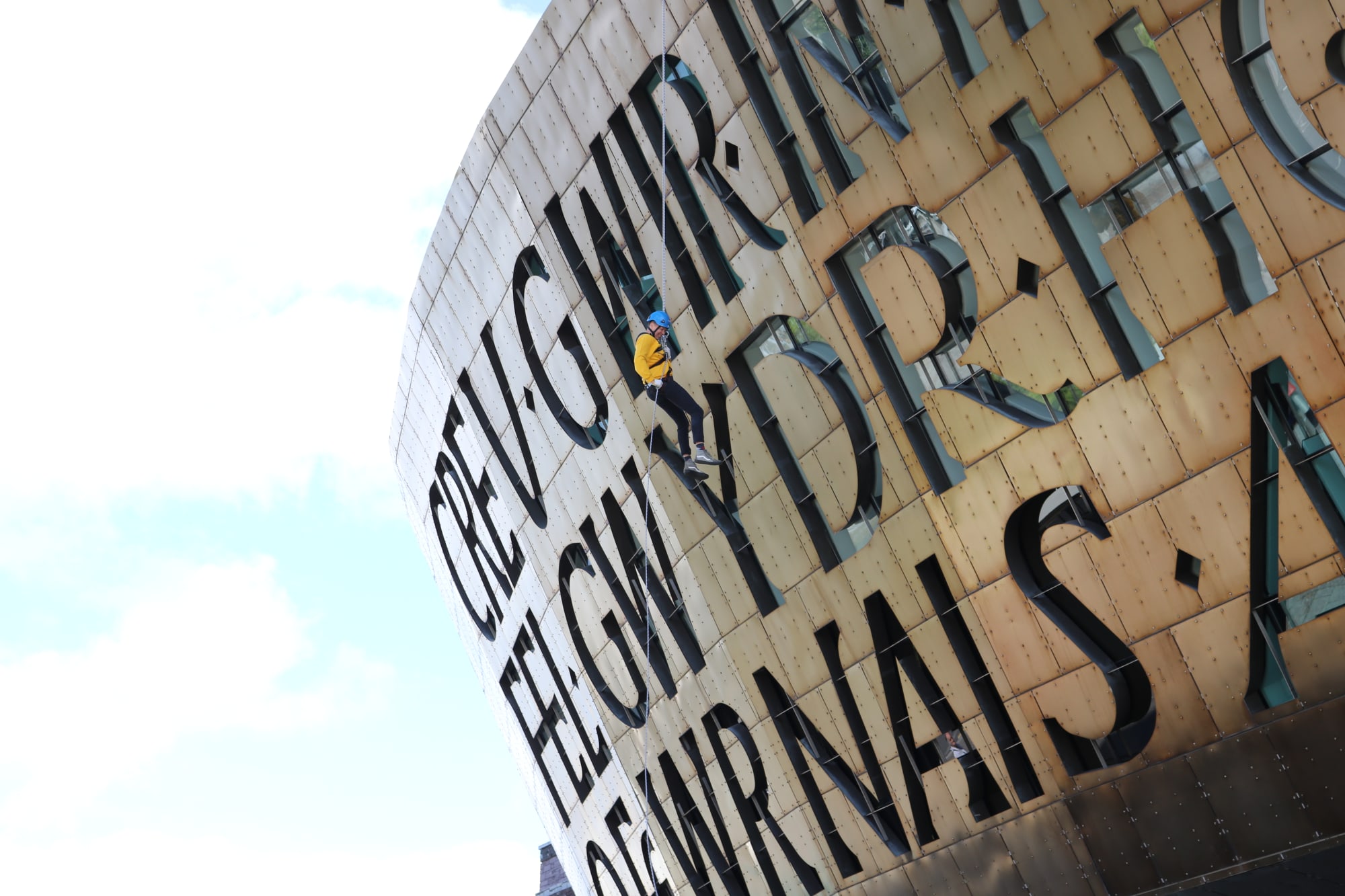 Paratowch ar gyfer antur fyrthgofiadwy – cyfle i gael golygfa unigryw o’n harysgrif enwog drwy abseilio dros do copr Canolfan Mileniwm Cymru, wrth godi arian i gefnogi ein helusen!
